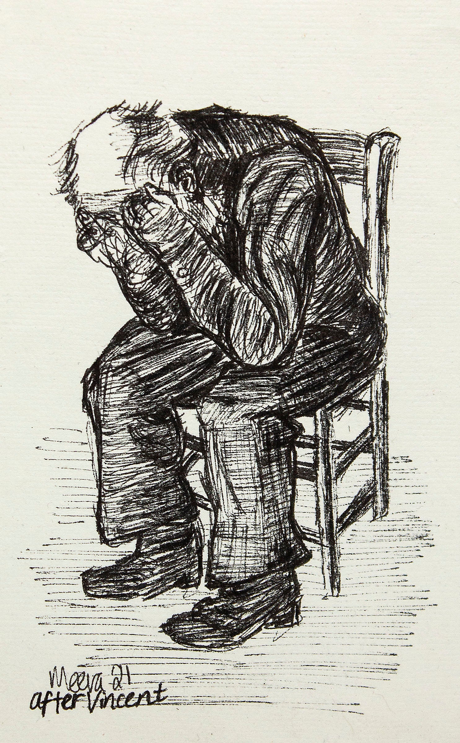 Small pen drawing from 2021 after Vincent van Gogh's pencil drawing Worn Out, 1882. Dimensions are 5.25 x 3.5 inches (13 x 9 cm).