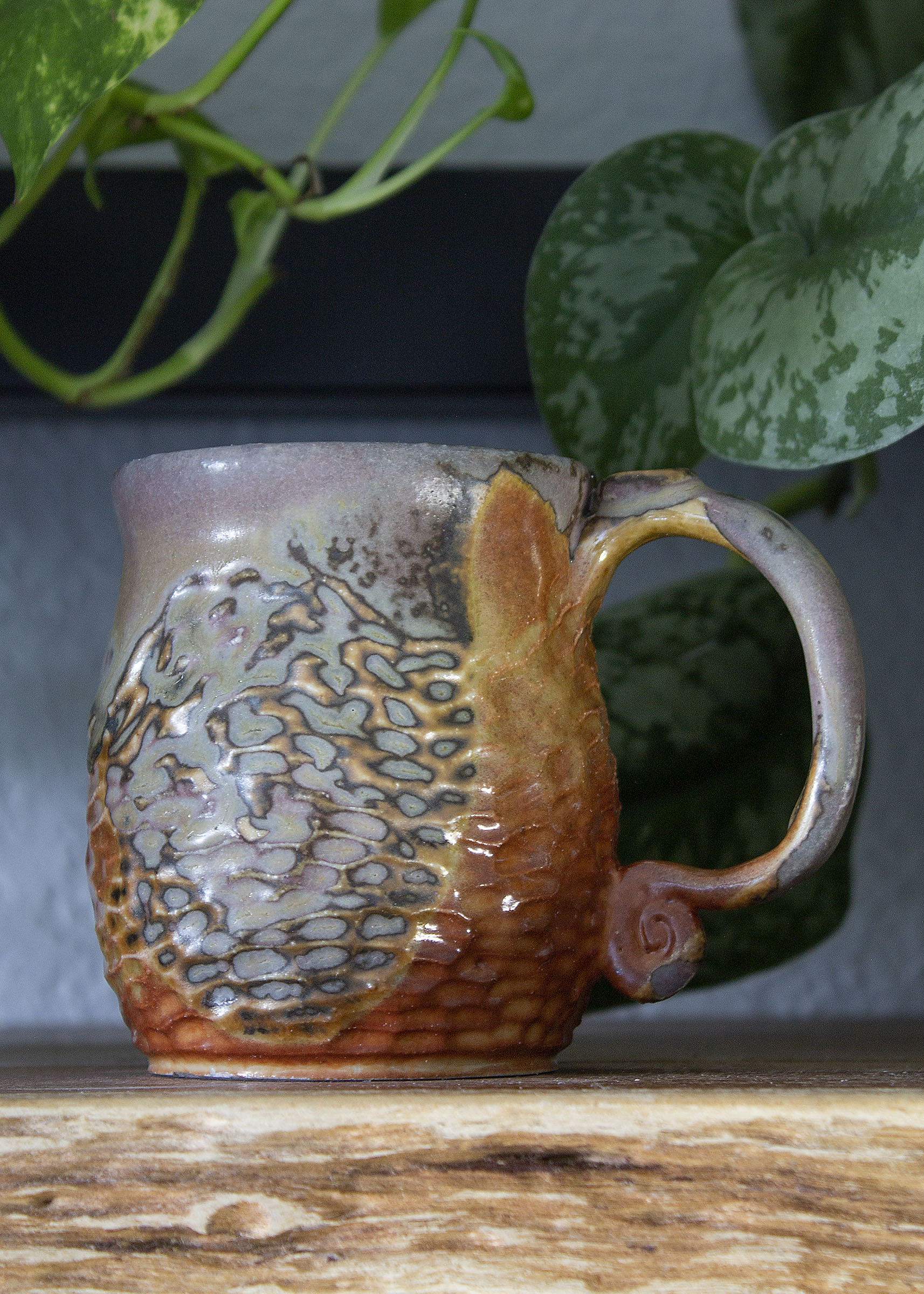 Handmade mug. Dimensions are 3.75 x 4.75 inches (9.5 x 12 cm).