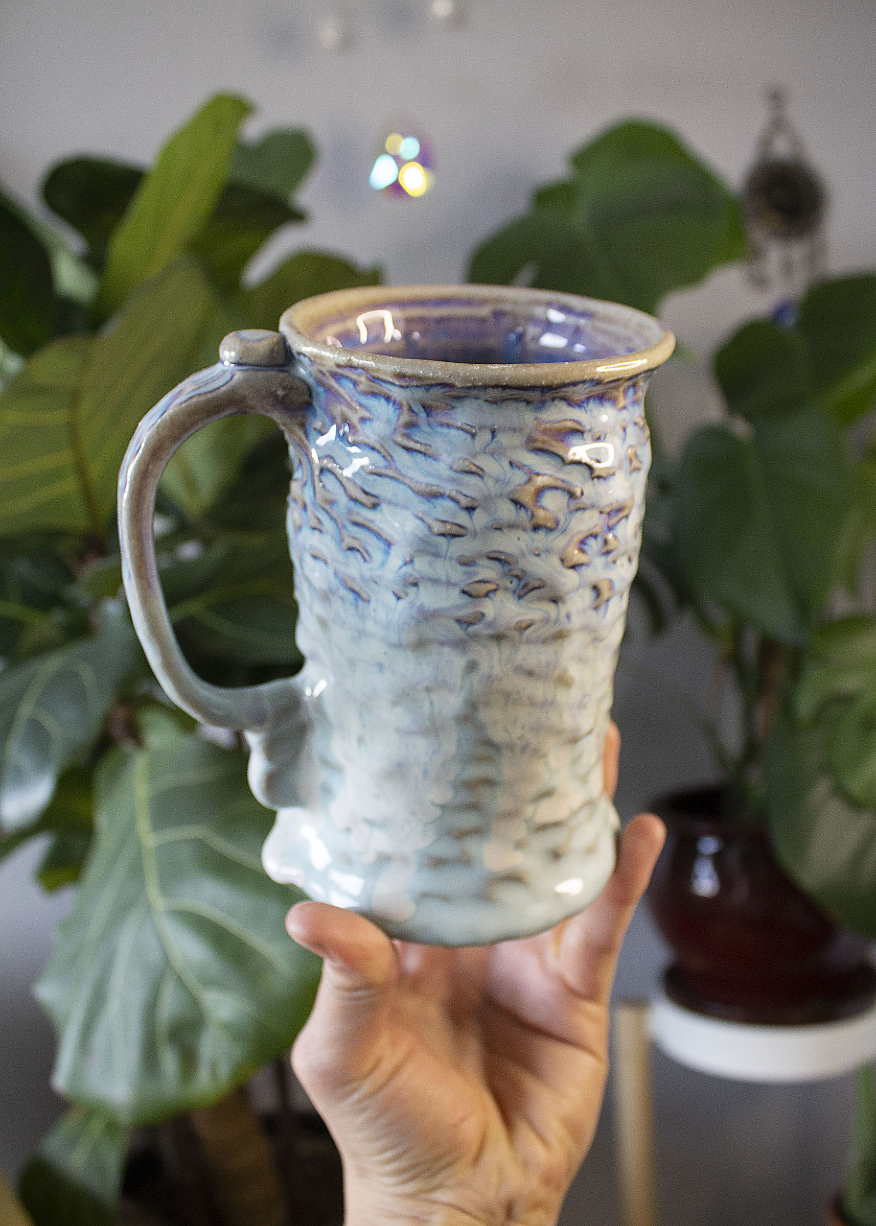 Handmade mug. Dimensions are 4 x 4.75 inches (10.2 x 12 cm).