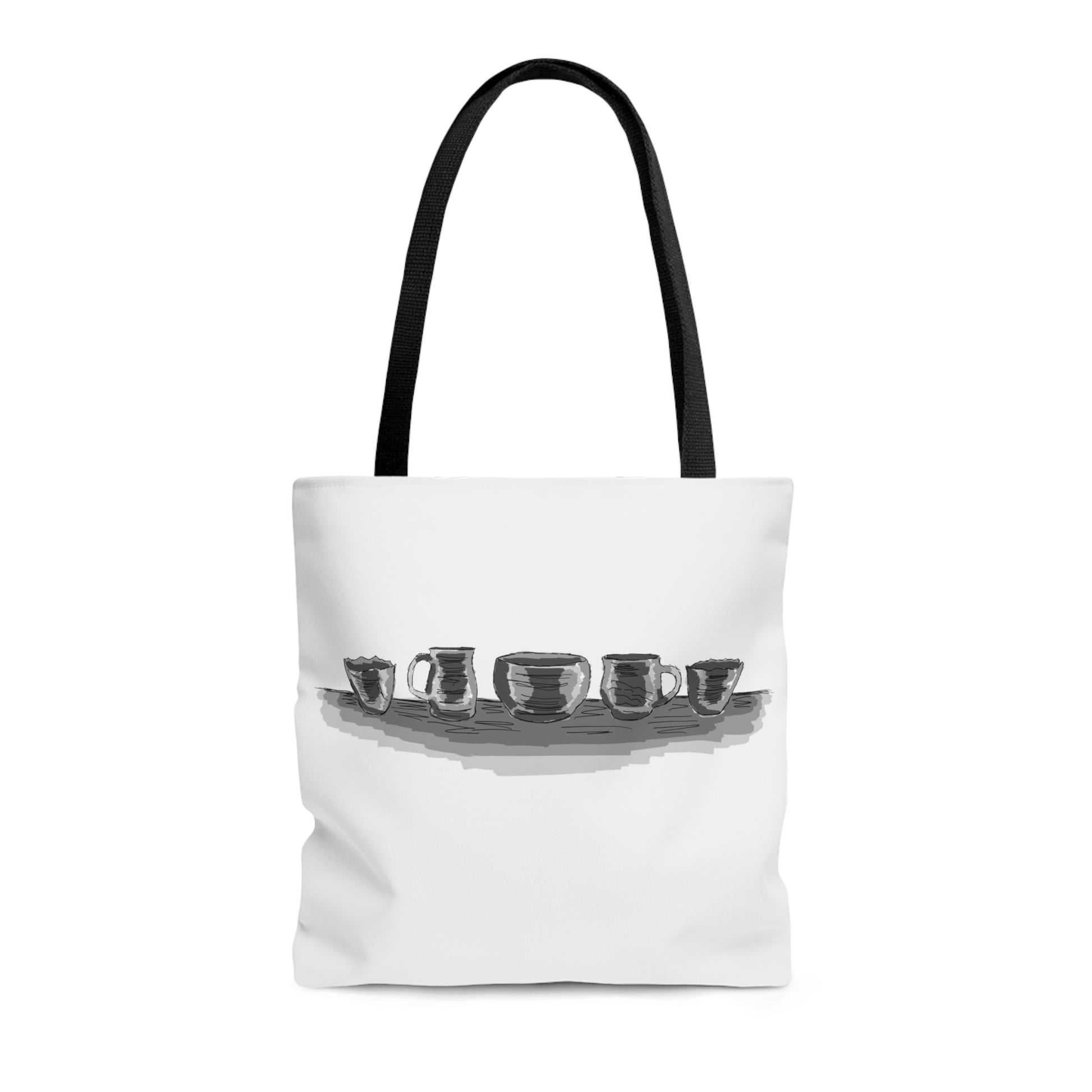 White tote bag with a drawing of five of my pottery pieces. Please note that color might vary slightly from stock image.